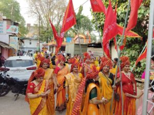 दोपहर 4 बजे कोरीघाट स्थित मंदिर से भव्य शोभायात्रा निकाली गई, जिसका नेतृत्व मातृशक्ति ने किया। पारंपरिक वेशभूषा में सजी महिलाओं ने केसरिया ध्वज थामे भक्ति और उत्साह का अद्भुत प्रदर्शन किया। ढोल-नगाड़ों और डीजे की धुनों पर श्रद्धालु नाचते-गाते आगे बढ़ते रहे, जिससे पूरा शहर उत्सवमय नजर आया।