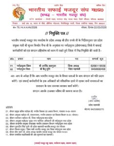 जिले में भारतीय सफाई मजदूर संघ द्वारा संगठन को सशक्त बनाने की दिशा में अहम कदम उठाया गया है। प्रदेश संयुक्त मंत्री शुभम किशोर मैना ने जिला स्तर पर नई नियुक्तियों की घोषणा करते हुए अरविंद बरगुजर को जिला अध्यक्ष एवं बेजु लुटेरे को जिला महामंत्री पद की जिम्मेदारी सौंपी है।